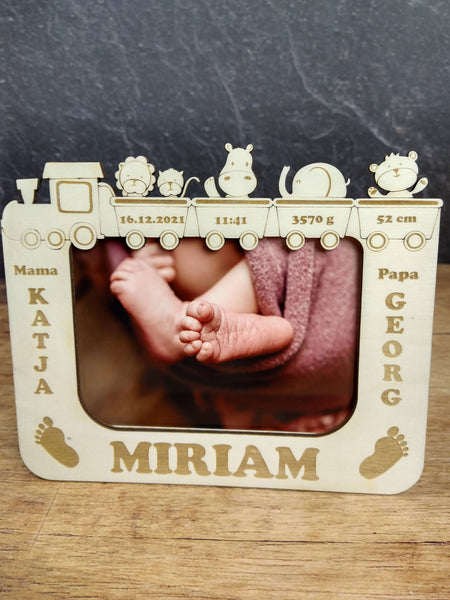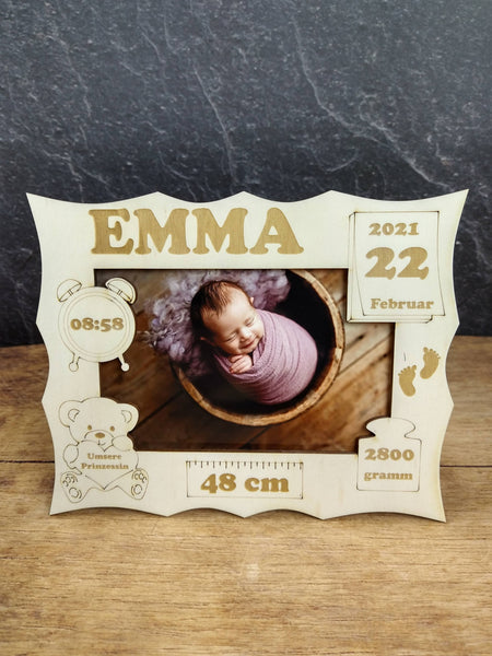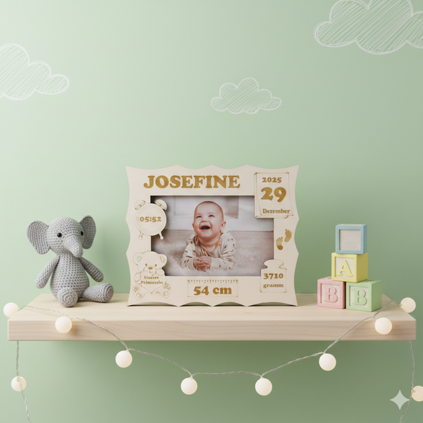 Wunderschöner personalisierter Fotorahmen mit den Geburtsdaten vom Baby. Das ideale Geschenk zur Geburt und ein echter Hingucker in jedem Kinderzimmer.